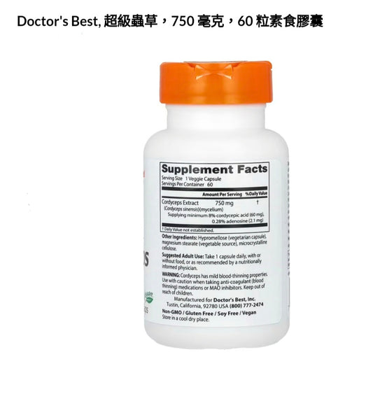清貨~Doctor's Best, 超級蟲草,750 毫克,60 粒素食膠囊, 包郵,效期: 2025 年 11 月 30 日,最後一樽